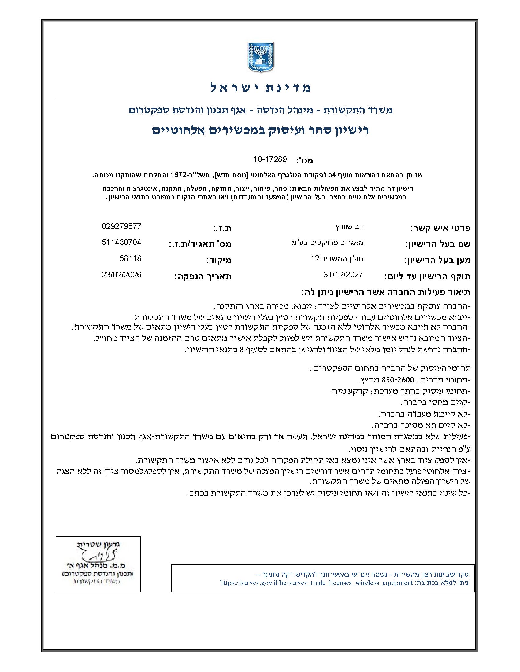 מאגרים פרויקטים נושאת רישיון סחר ועיסוק במכשירים אלחוטיים מטעם משרד התקשורת,